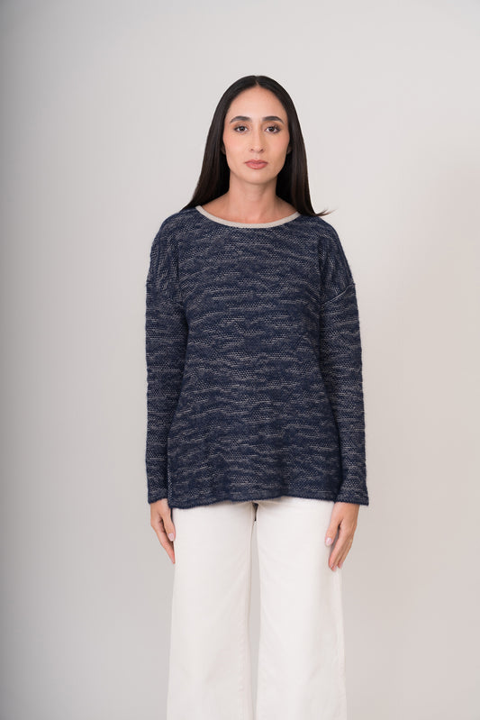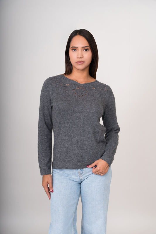 Suéter de mujer con delicado calado decorativo en el escote. Confeccionado con una suave mezcla...