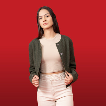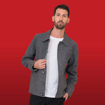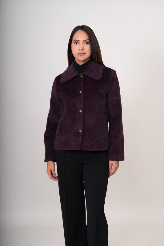 Tejido grueso y uniforme, con una caída estructurada. Chaqueta de corte recto con cuello camisero....