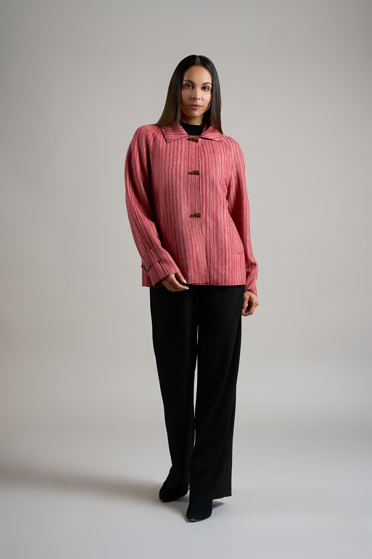 Saco Remate 135, confeccionado en una mezcla de lana y nylon. Presenta tres botones de cacho en la parte frontal y un cuello tipo camisero que aporta un estilo clásico y definido. Cuenta con bolsillos a los costados y una silueta ligeramente más amplia en la parte baja, lo que brinda comodidad y un calce relajado sin perder elegancia. | Material predominante: Wool
