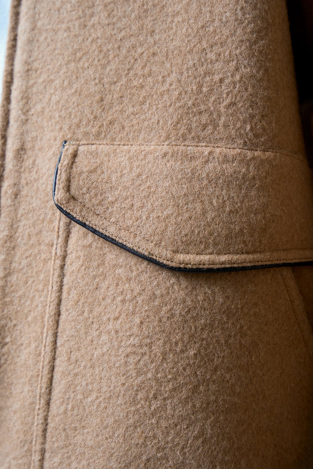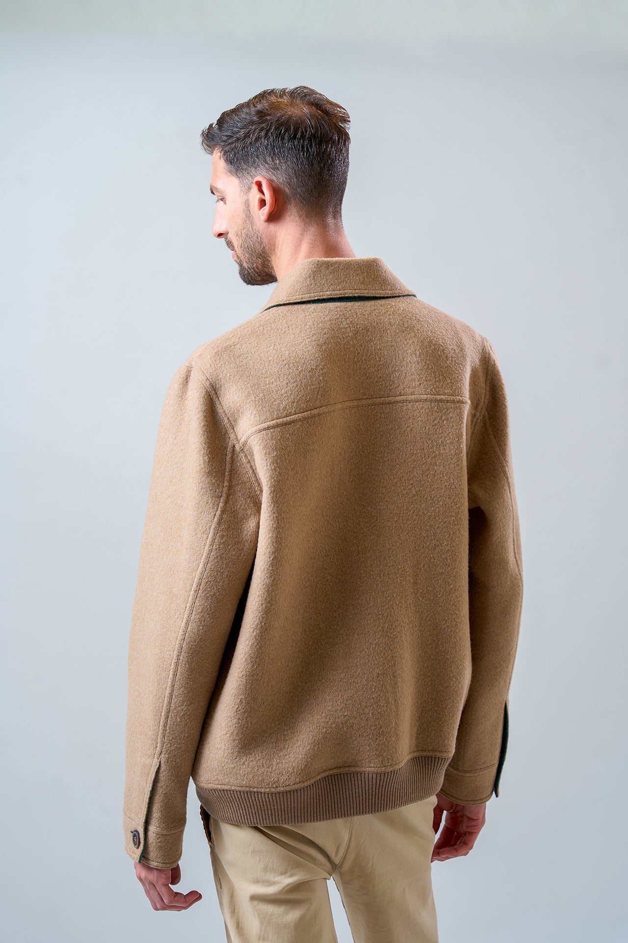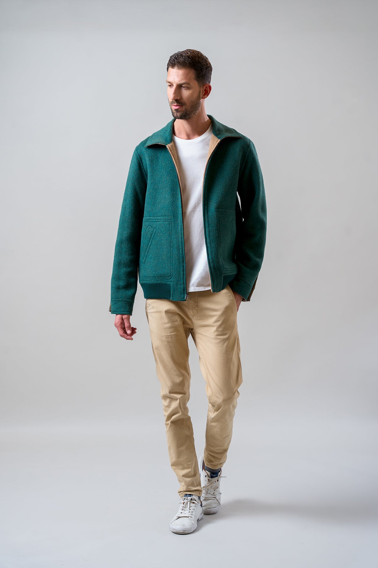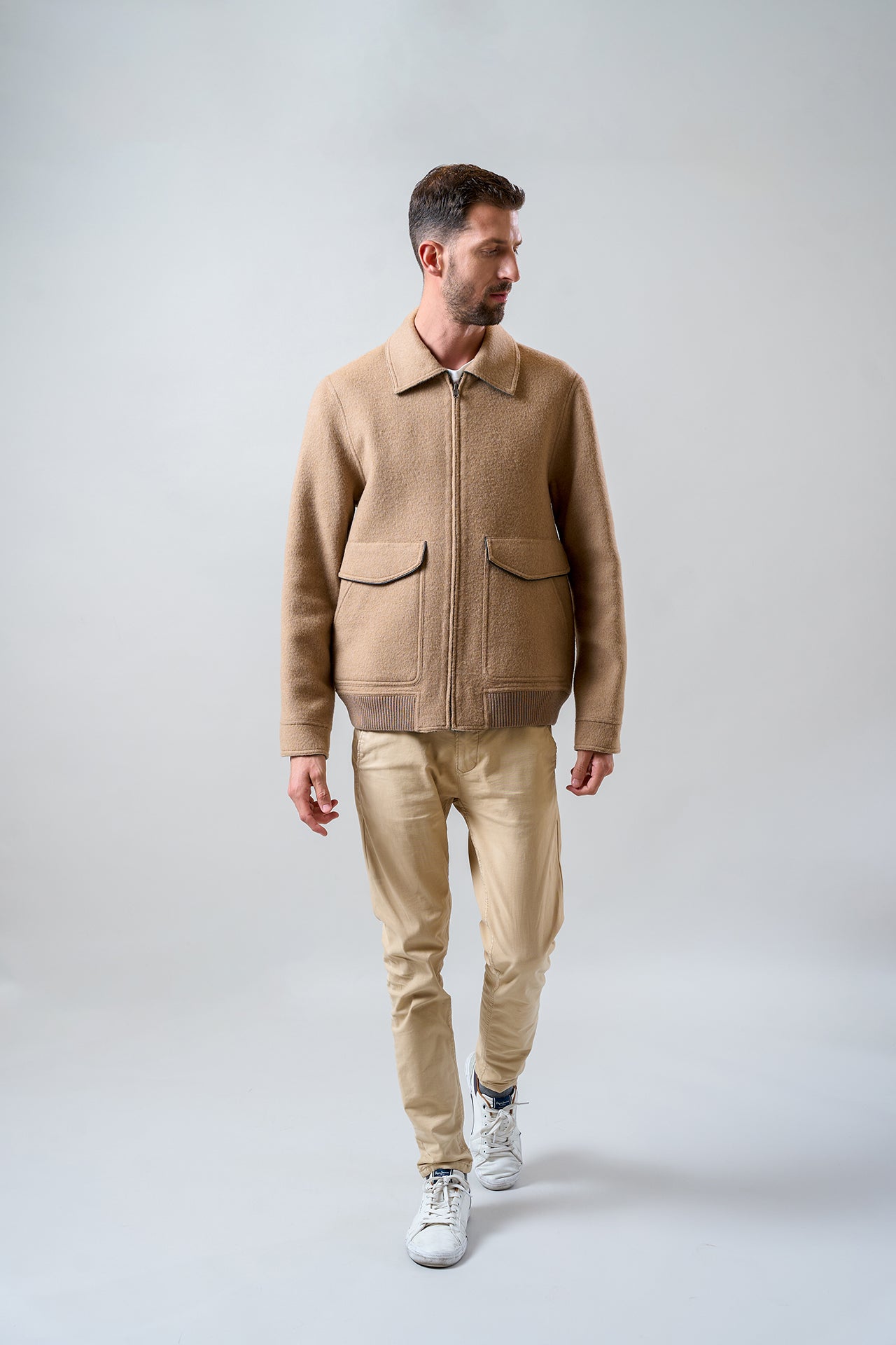 Saco Remate 136 confeccionado en baby alpaca, wool y nylon, reversible y de color entero. Presenta cuello tipo camisero, bolsillos en la parte baja y cierre metálico central, ofreciendo una prenda versátil, elegante y práctica para cualquier ocasión. | Material predominante: Baby Alpaca