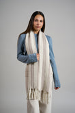 Lady scarf Remate 119 confeccionado en baby alpaca y wool, con flecos largos y diseño de rayas horizontales en dos tonos. Ofrece un accesorio elegante, cálido y versátil, ideal para complementar cualquier look con estilo y sofisticación. | Material predominante: Baby Alpaca