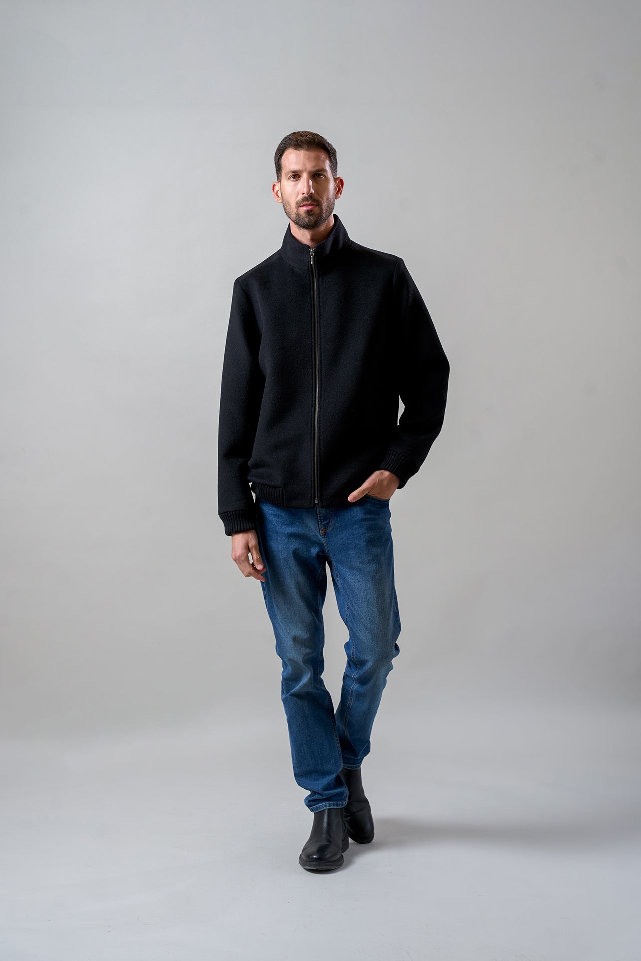 Casaca Remate 115 confeccionada en wool, baby alpaca y nylon, de color entero. Presenta estilo clásico, bolsillos en los costados, cierre metálico hasta el cuello y pretina en puños y cintura, ofreciendo una prenda elegante, práctica y versátil para cualquier ocasión. | Material predominante: Wool
