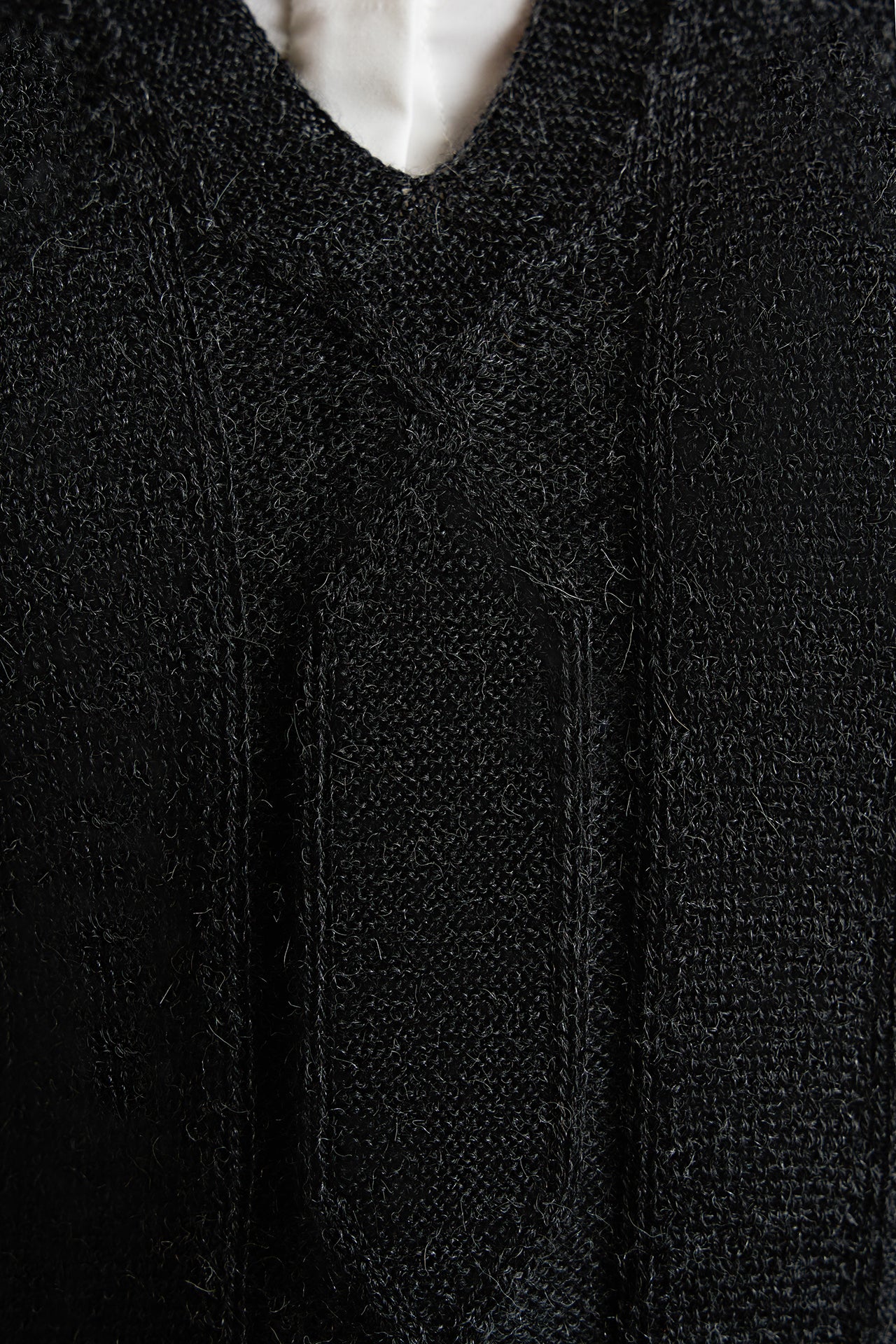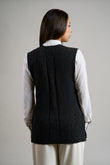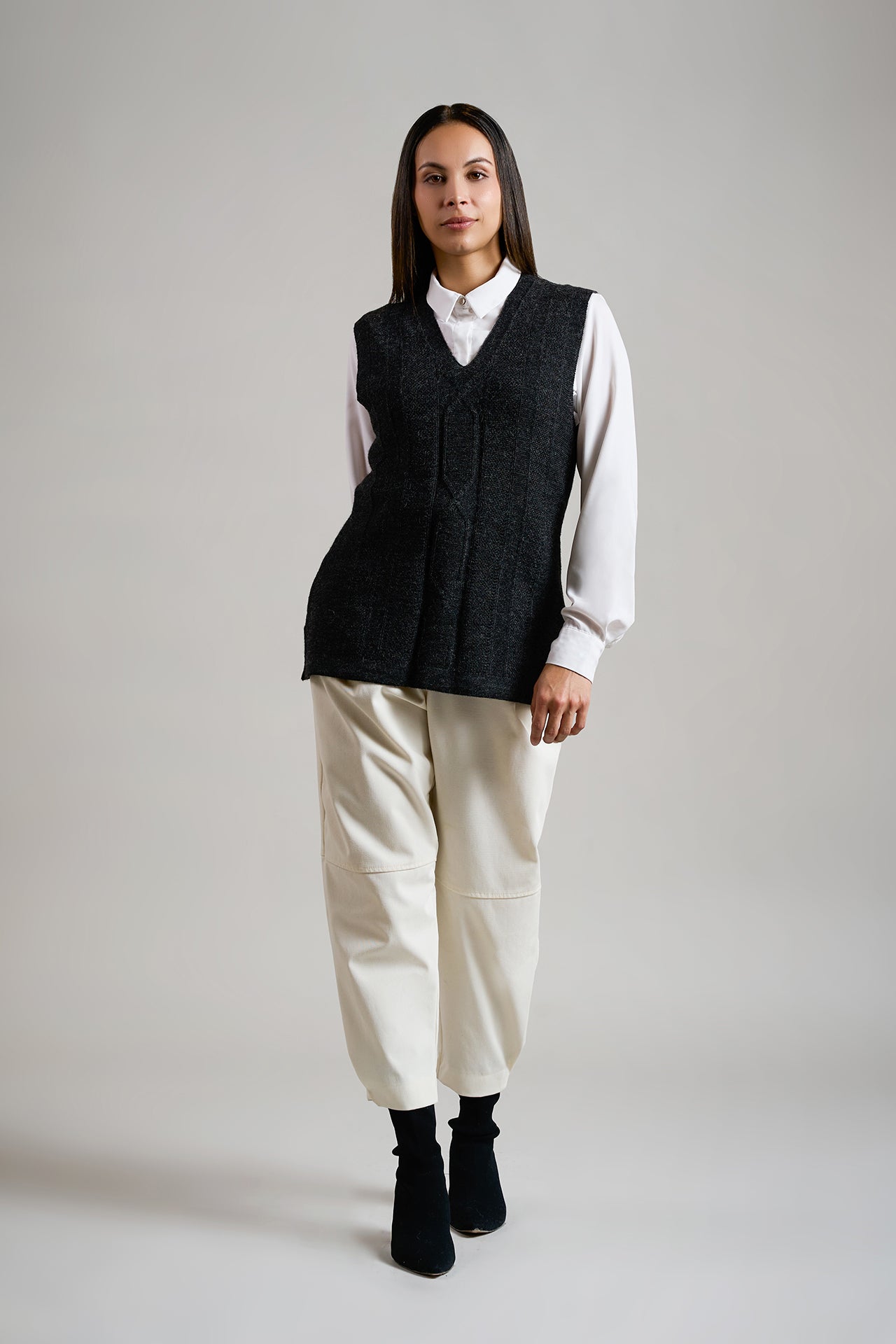 Chaleco Remate 121, elaborado en una mezcla de alpaca y lana. Es una prenda de punto de color entero, con cuello en V y mangas cero, ofreciendo una estética limpia y moderna. En la parte frontal presenta un diseño tejido. | Material predominante: Alpaca