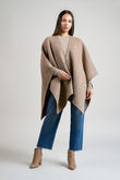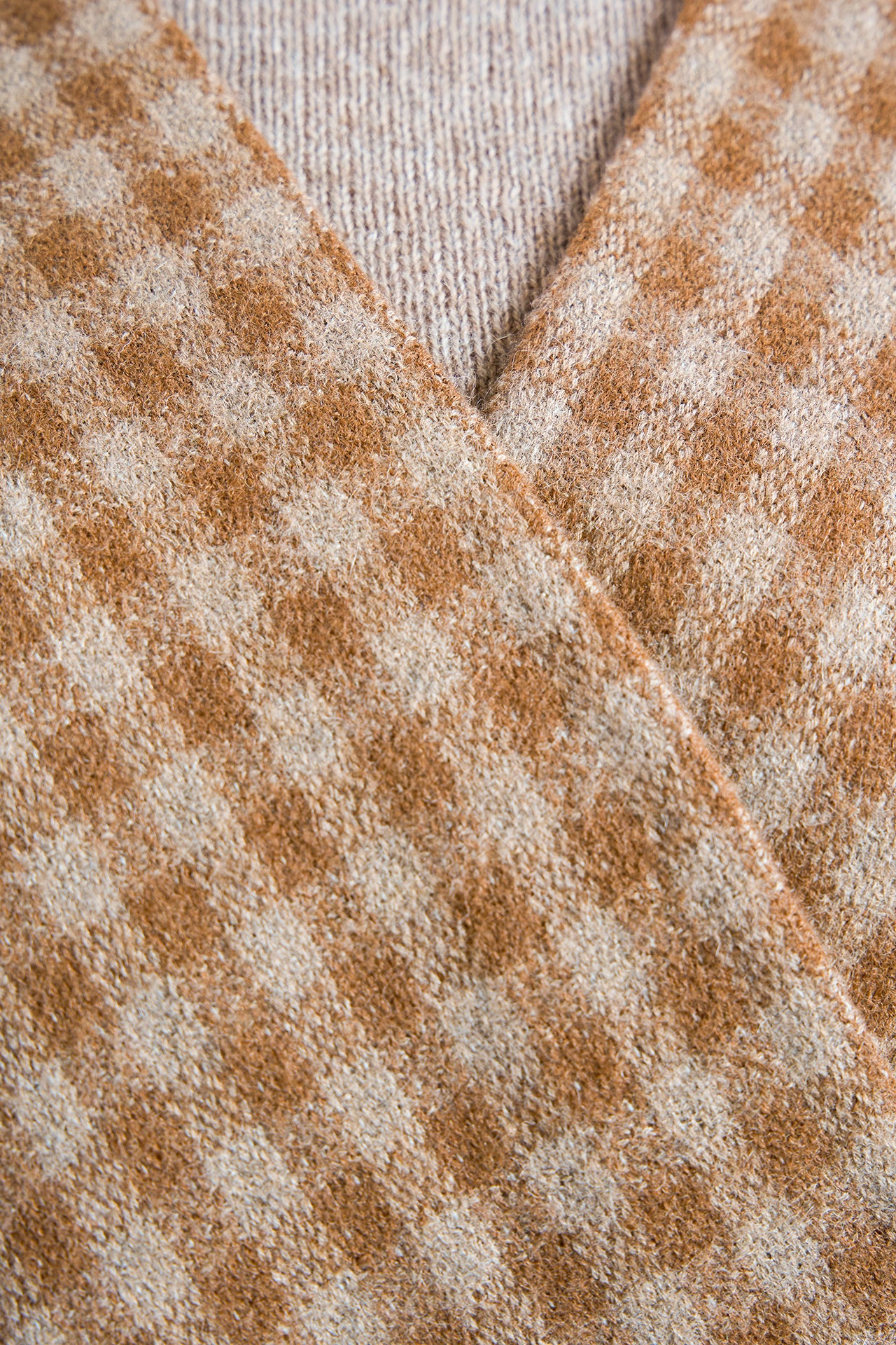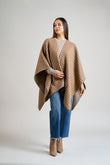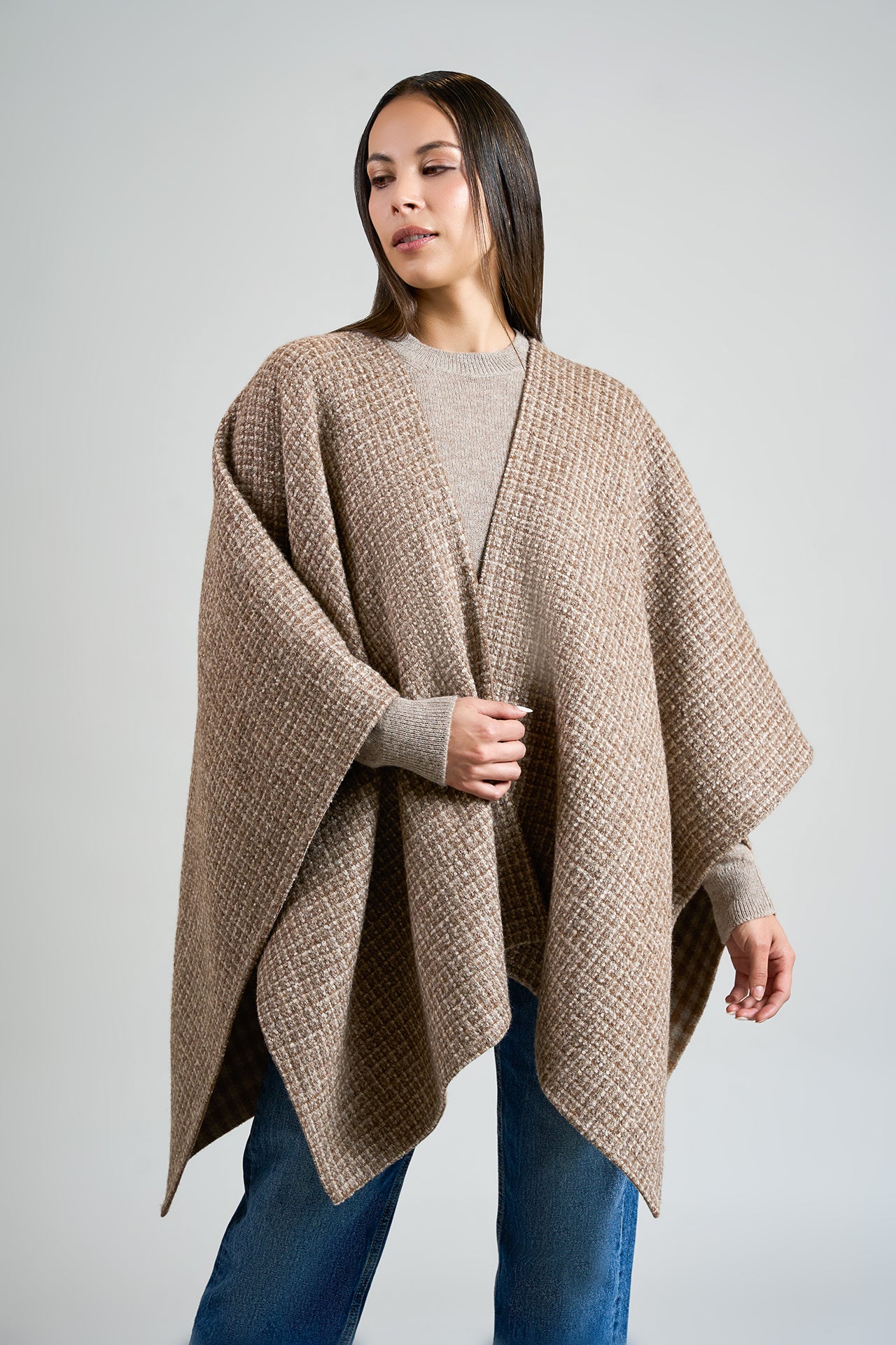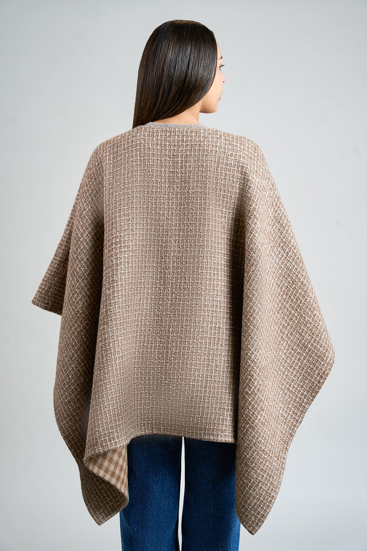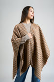Capa Remate 111 elaborada en baby alpaca eco, silk eco y wool eco, reversible con un lado de diseño en cuadrados y el otro de color entero. Presenta una caída limpia y en punta, ofreciendo una prenda versátil, elegante y sofisticada, ideal para cualquier look. | Material predominante: Baby Alpaca