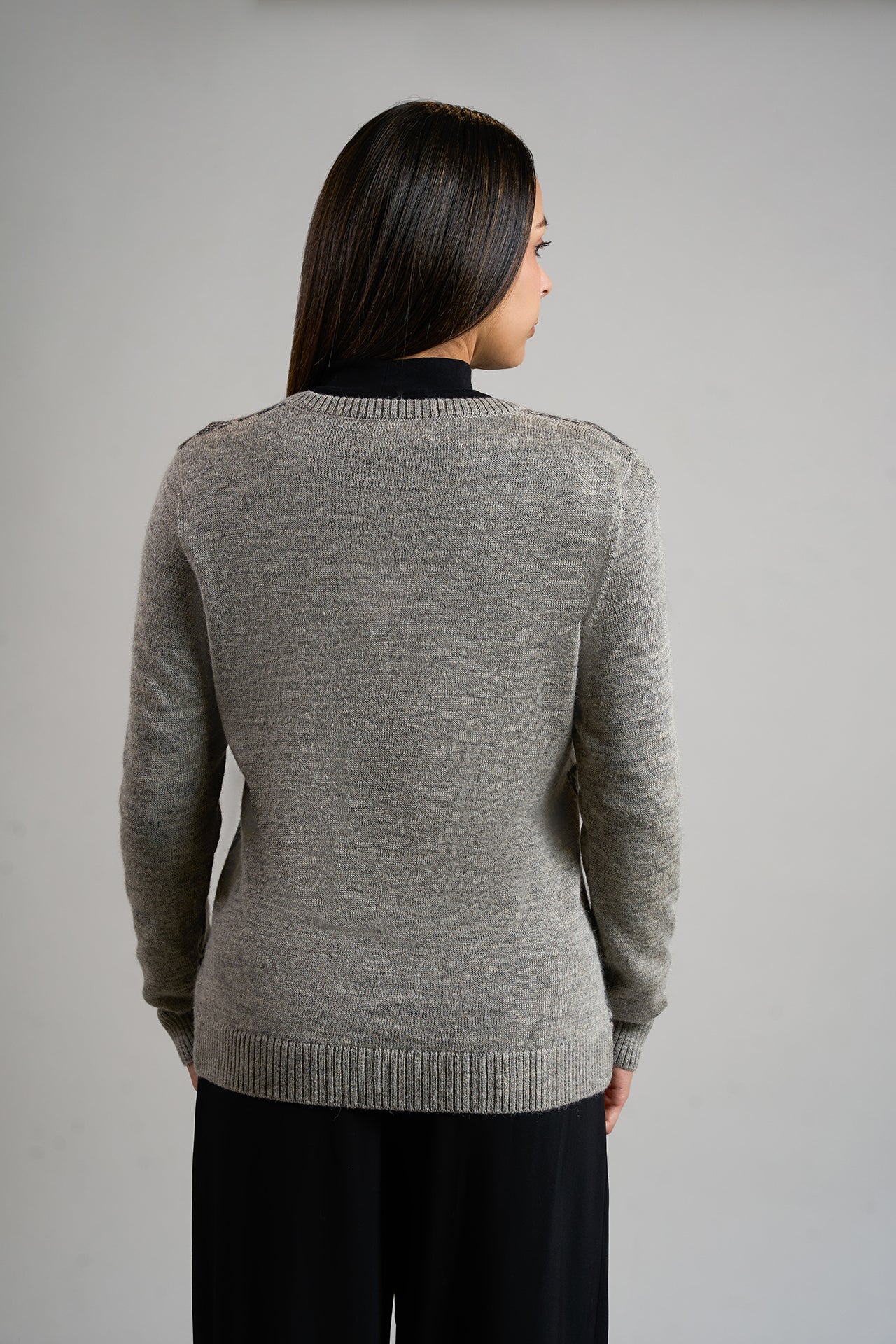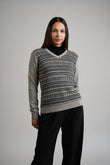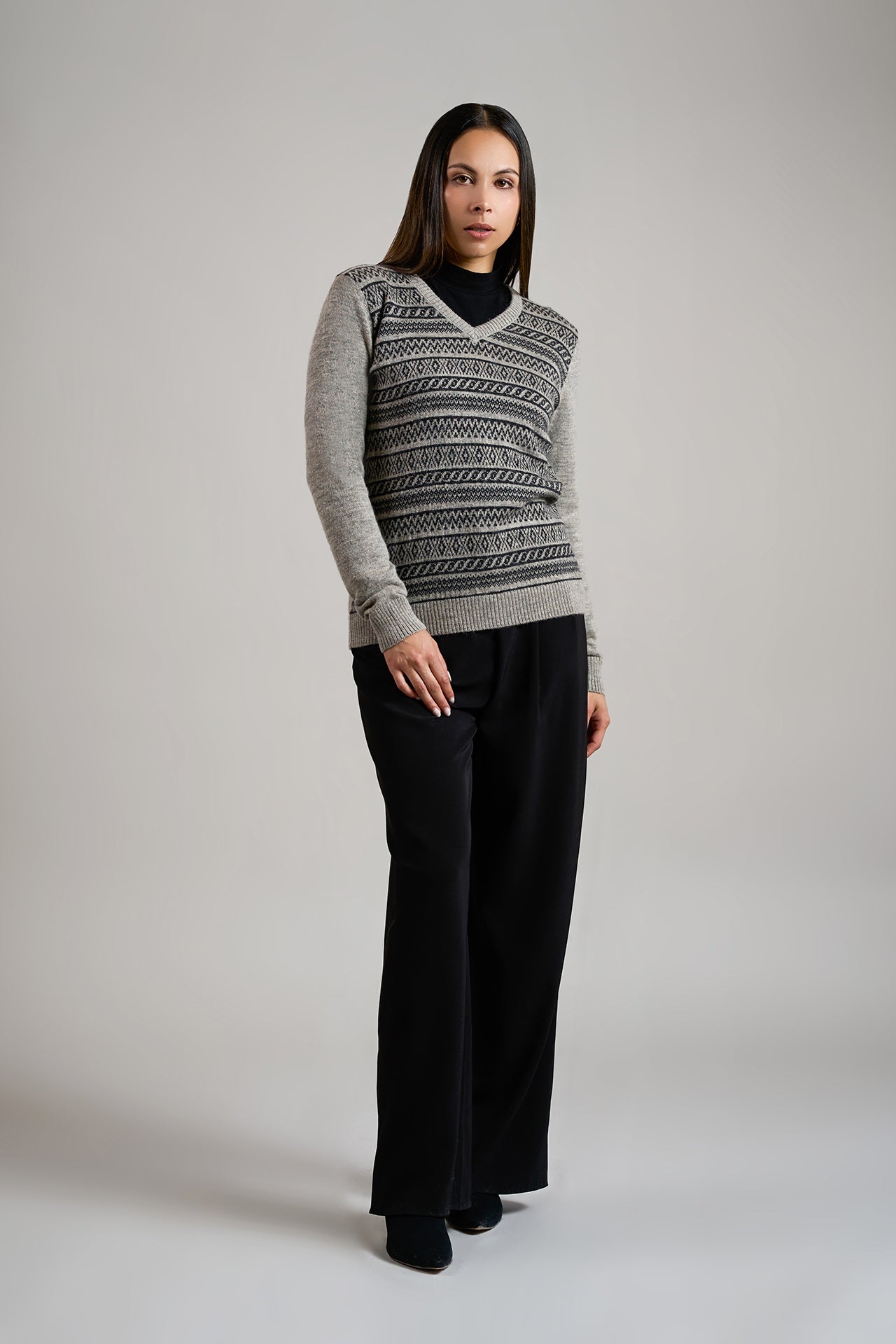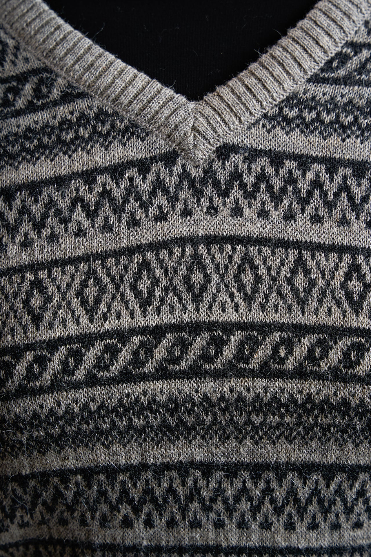 Chompa Remate 133, confeccionada en 100% baby alpaca. Presenta un cuello en V y un diseño étnico en la parte frontal que aporta carácter y detalle artesanal. La espalda mantiene un color pleno que equilibra el diseño, mientras que las mangas largas completan una silueta cómoda y bien definida. | Material predominante: Baby Alpaca