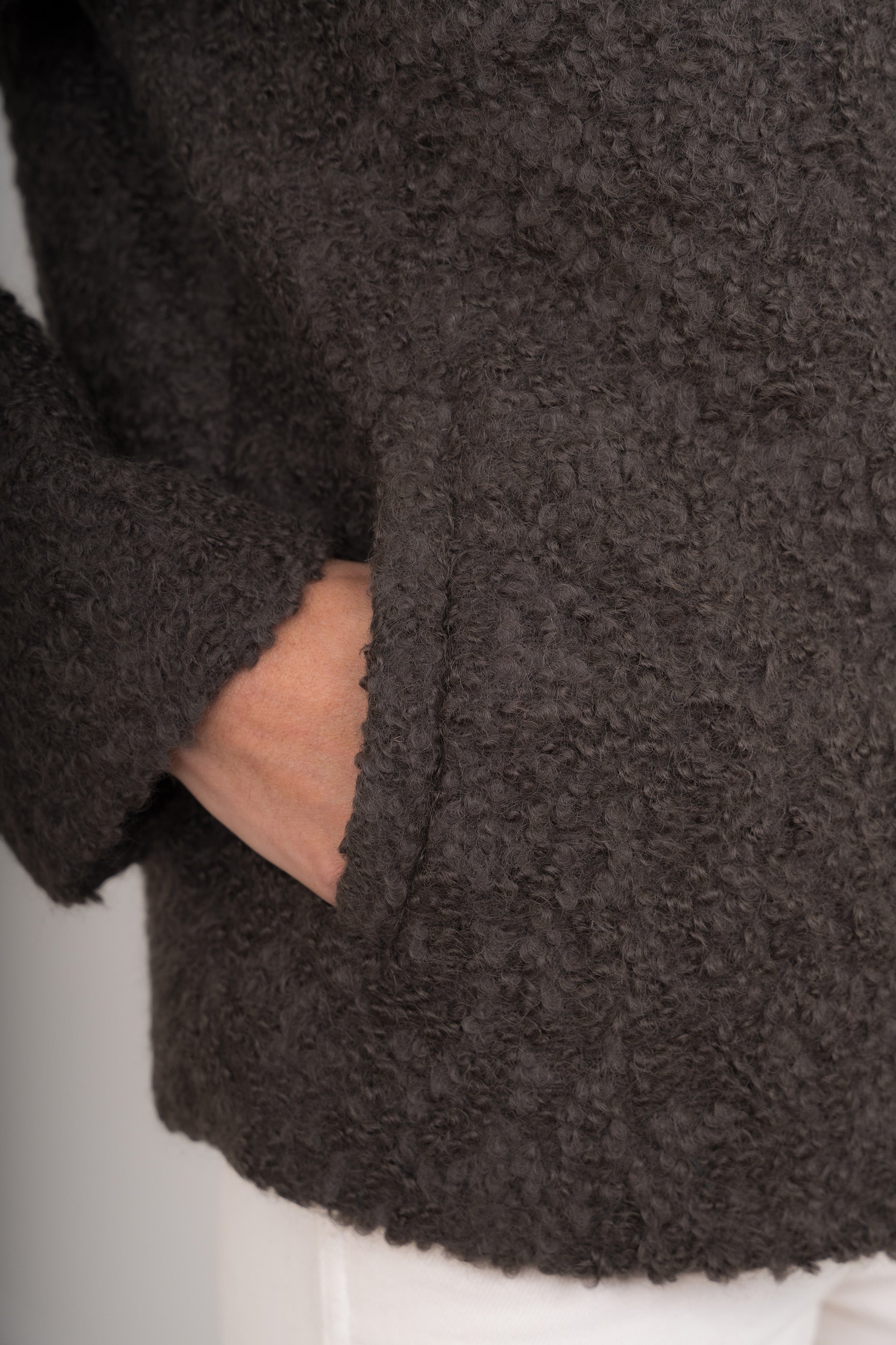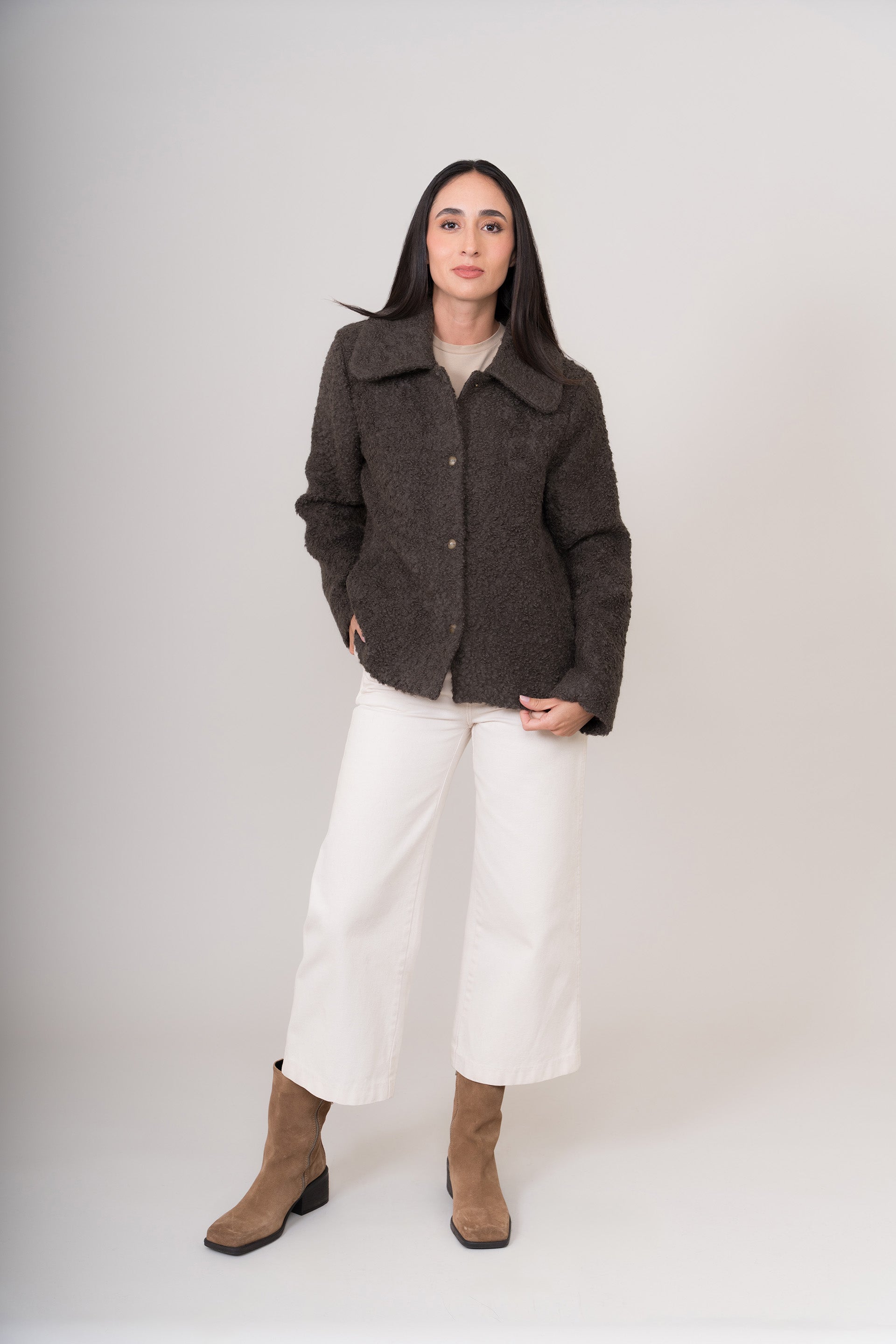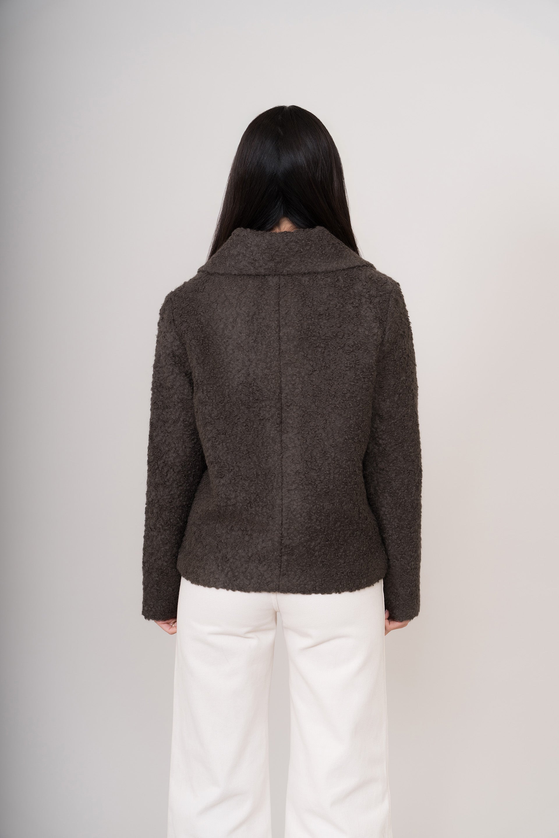 Casaca de corte recto con cuello camisero. Tejido grueso y uniforme, con una caída estructurada. Mezcla de suri alpaca, lana y nylon. Cierre frontal con botones visibles. | Material predominante: Alpaca