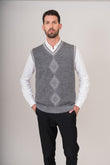 Chaleco de punto fino en cuatro colores. Mezcla de algodón pima, alpaca y lana. Diseño clásico con cuello en V y patrón de rombos. Corte recto, ribetes en contraste. Versátil en tonos grises y blancos. | Material predominante: Cotton