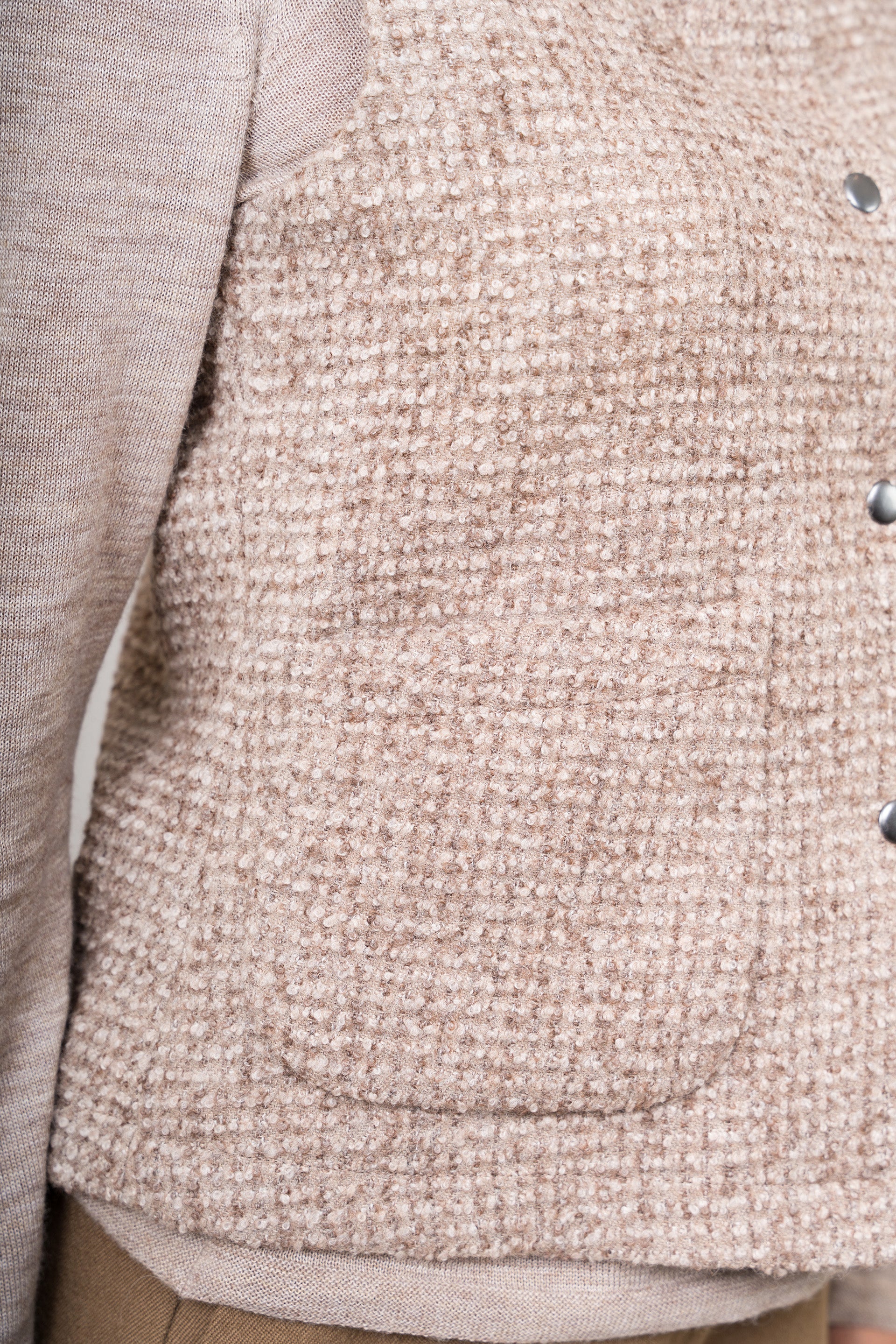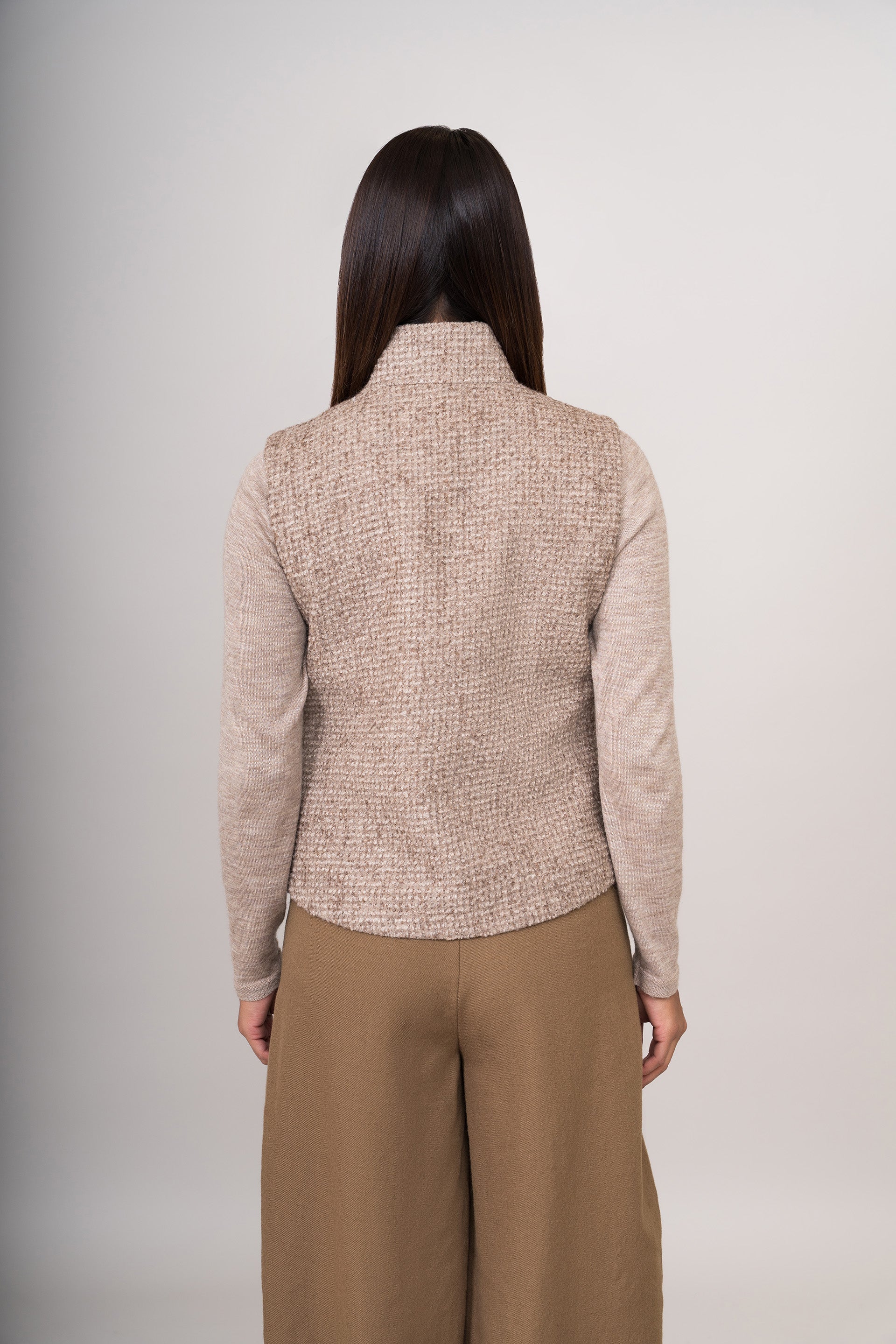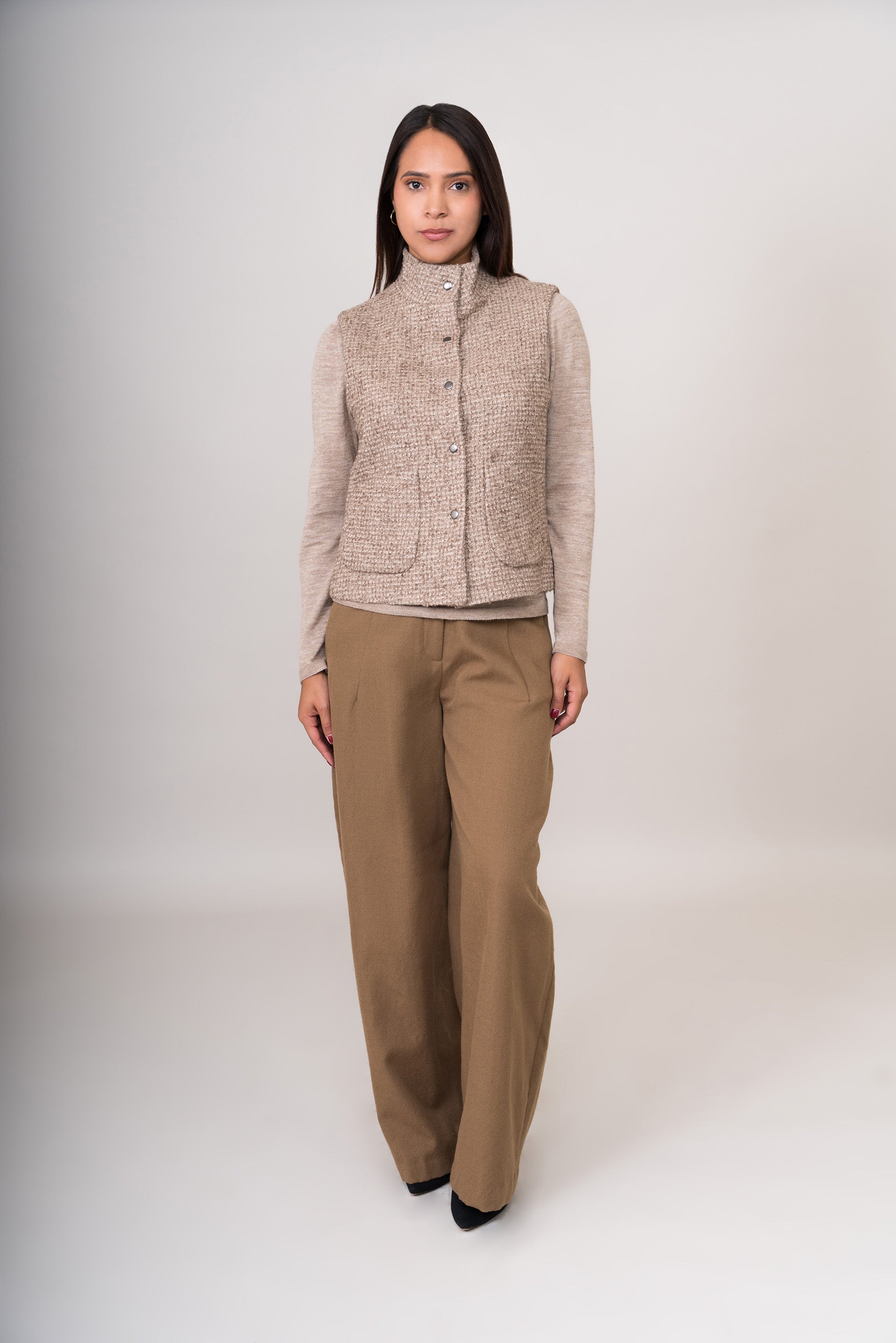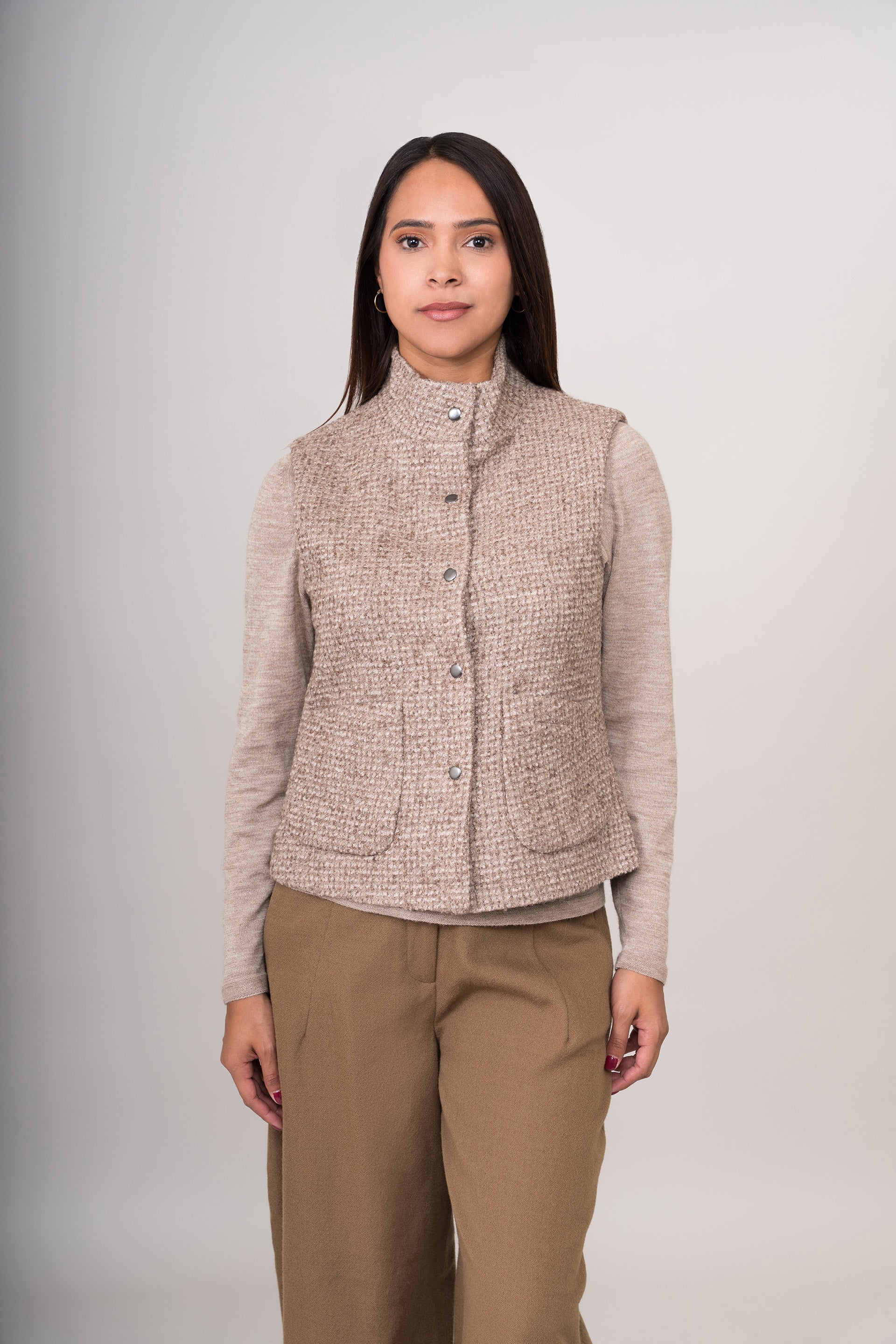 Chaleco de punto fino en mezcla de baby alpaca eco y seda eco. Diseño moderno con cuello alto y botones. Textura suave y ligera. Corte recto y cómodo. Bolsillos frontales. Tonos grises y negros, versátil. | Material predominante: Baby Alpaca