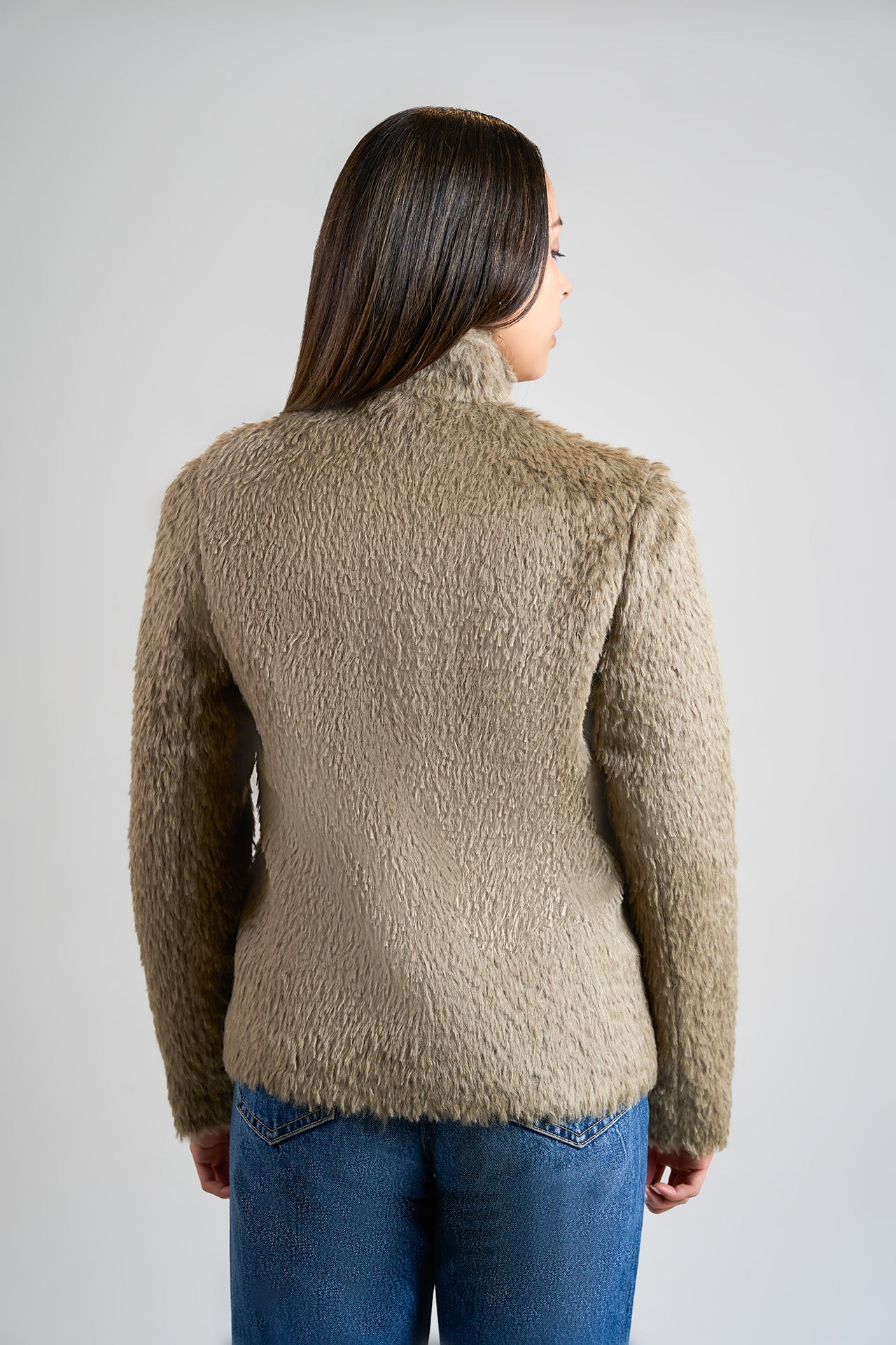 Saco Remate 131, confeccionado con una mezcla de suri alpaca, lana y nylon, elaborado en tela zibelinada que aporta una textura suave y elegante. Presenta cierre metálico interno, cuello alto y bolsillos funcionales. Su diseño llega a la altura de la cintura, ofreciendo una apariencia moderna y bien estructurada. | Material predominante: Suri Alpaca